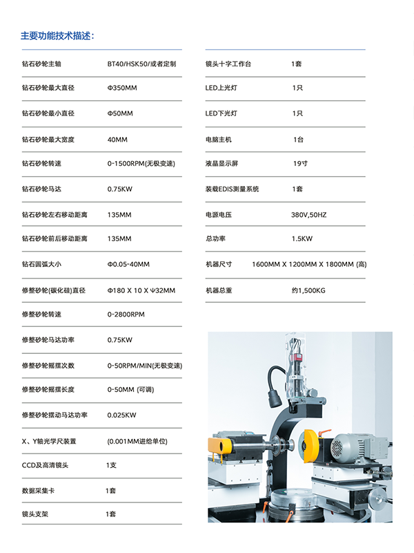 機床主軸砂輪作為被修整的金剛石砂輪或CBN砂輪,附件上所安裝的砂輪作為修整砂輪即綠色碳化硅砂輪;被修整砂輪二個方向可以調(diào)整,即X軸、Y軸;修整砂輪有三個方向可以調(diào)整,即旋轉(zhuǎn)A軸、X1軸和Y1軸,并且可以變頻調(diào)速的往復擺動,除此之外,X1軸和Y1軸之間可以旋轉(zhuǎn)和定位,可以實現(xiàn)修整砂輪做180°旋轉(zhuǎn);機床配有CCD光學測量系統(tǒng)、光柵尺數(shù)顯測量系統(tǒng)、10到100倍之放大系統(tǒng)、液晶顯示器。