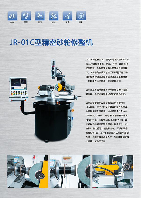 JR-01C砂輪修整機,既可以修整鉆石/CBN 砂輪,也可以修整平面、側(cè)面、角度、外圓弧和成型砂輪,單片砂輪和多片砂輪組合同時皆可。本機器是在鉆石砂輪/CBN砂輪及數(shù)個砂輪組成的砂輪軸上提供簡單及高效率的修整。機器不僅操作簡單,并且精準度高。